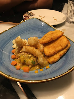 en tempura, leche de tigre, choclo y cebolleta. Creo recordar que era lubina el pescado del día.